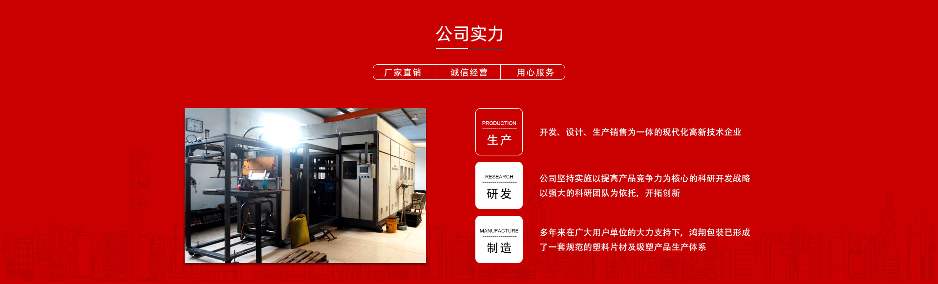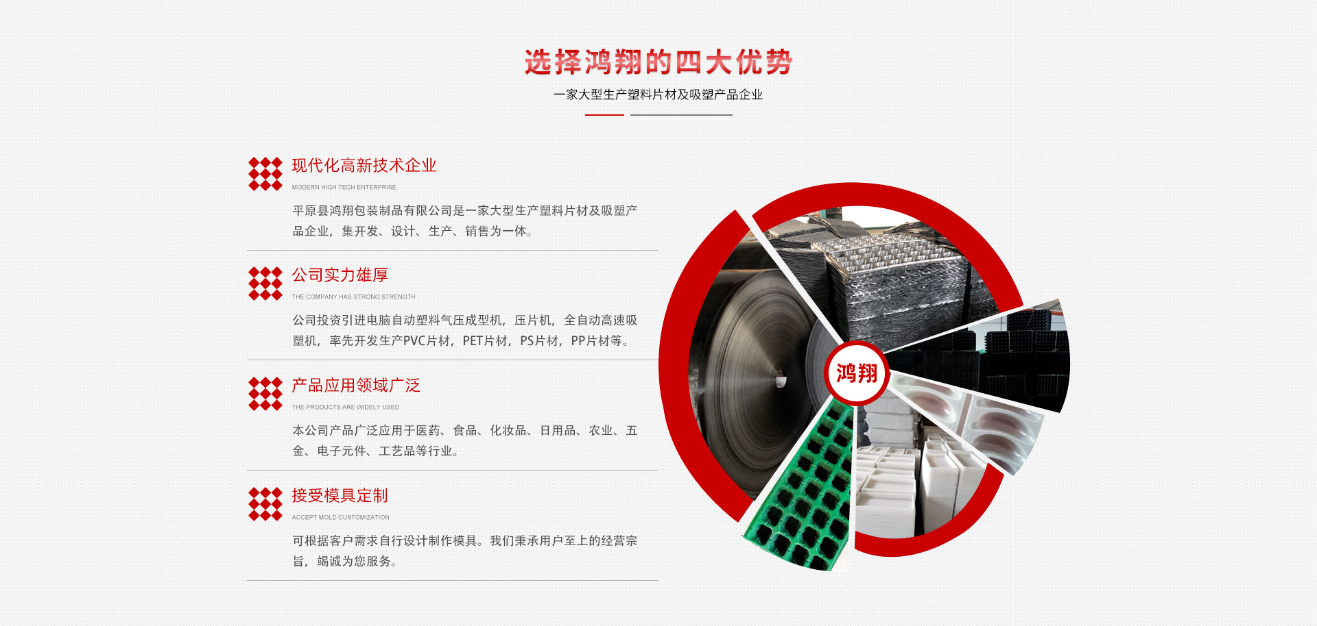 平原縣鴻翔包裝制品有限公司是一家大型生產(chǎn)塑料片材及吸塑產(chǎn)品企業(yè),本公司投資引進電腦自動塑料氣壓成型機,壓片機,全自動高速吸塑機,率先開發(fā)生產(chǎn)PVC片材,PET片材,PS片材,PP片材等,鴻翔是國內(nèi)先進的生產(chǎn)廠家之一。本公司產(chǎn)品廣泛應(yīng)用于醫(yī)藥、食品、化妝品、日用品、農(nóng)業(yè)、五金、電子元件、工藝品等行業(yè),也可根據(jù)客戶需求自行設(shè)計制作模具。本公司技術(shù)力量雄厚,生產(chǎn)設(shè)備工藝先進。我們秉承用戶至上的經(jīng)營宗旨,竭誠為您服務(wù)。
